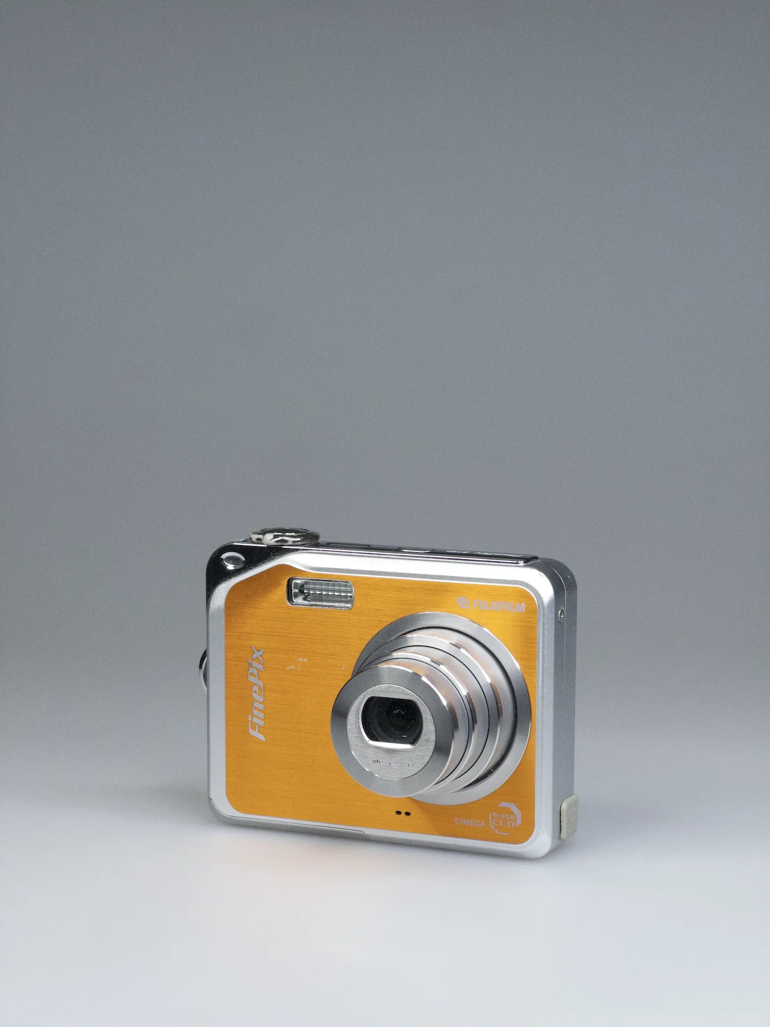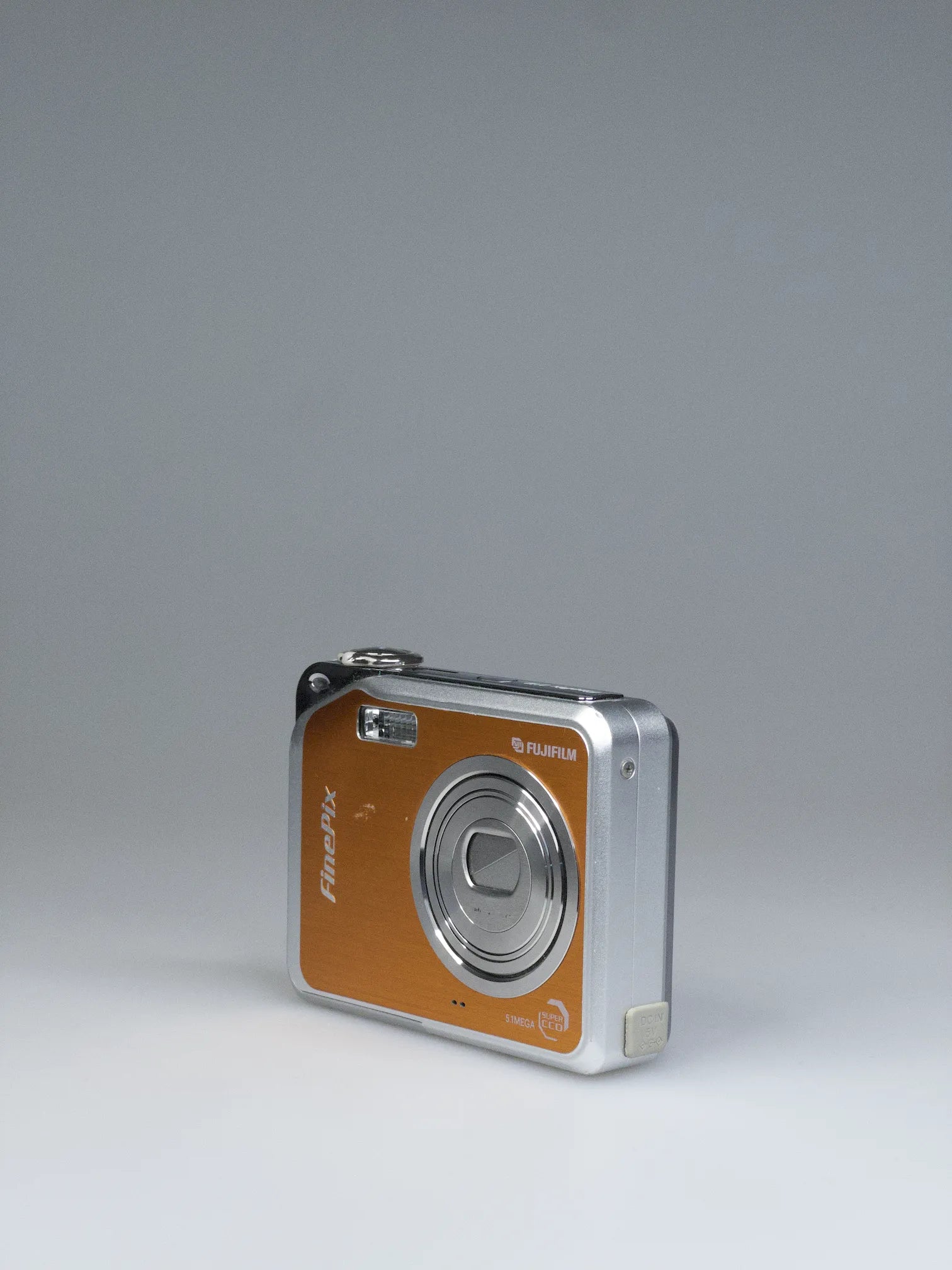 The V10 holds up because the sensor was excellent for its era, not because of the games. ISO 1600 at full resolution with Fujifilm's noise handling meant usable low-light shots that most contemporaries couldn't approach. The 3-inch LCD was ahead of the market by two years. The games aged from gimmick to charm. Orange is the right color for a camera that was never trying to blend in.