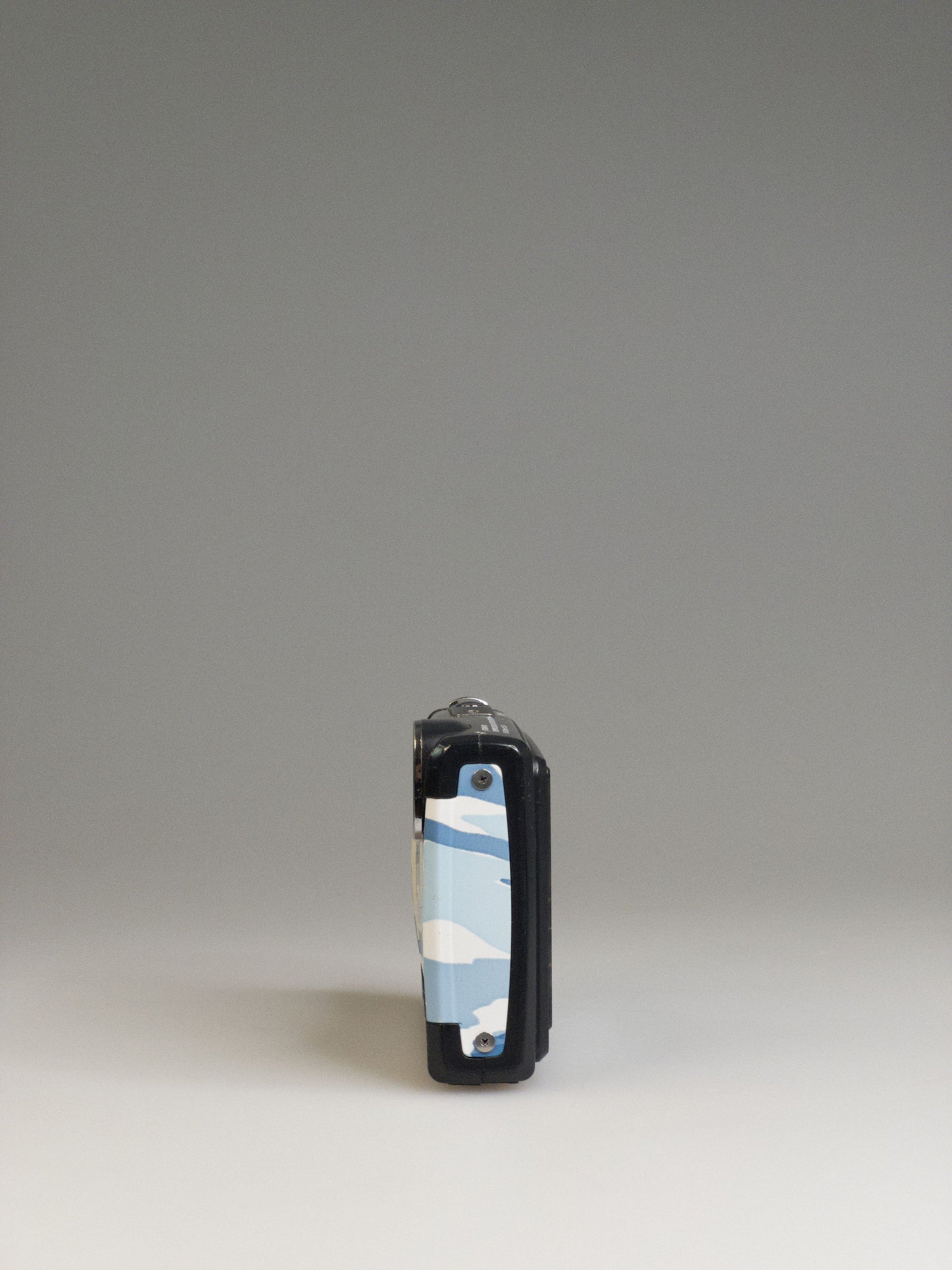 The blue camo finish gives the 6010 a playful, adventurous vibe that stands out from typical rugged gear. It’s pocket-sized but feels sturdy, with smooth metal accents and a clean, modern shape. The pattern adds a touch of early-2000s outdoor chic — the kind of camera you’d take from a hiking trail straight to a beach bar without missing a beat.