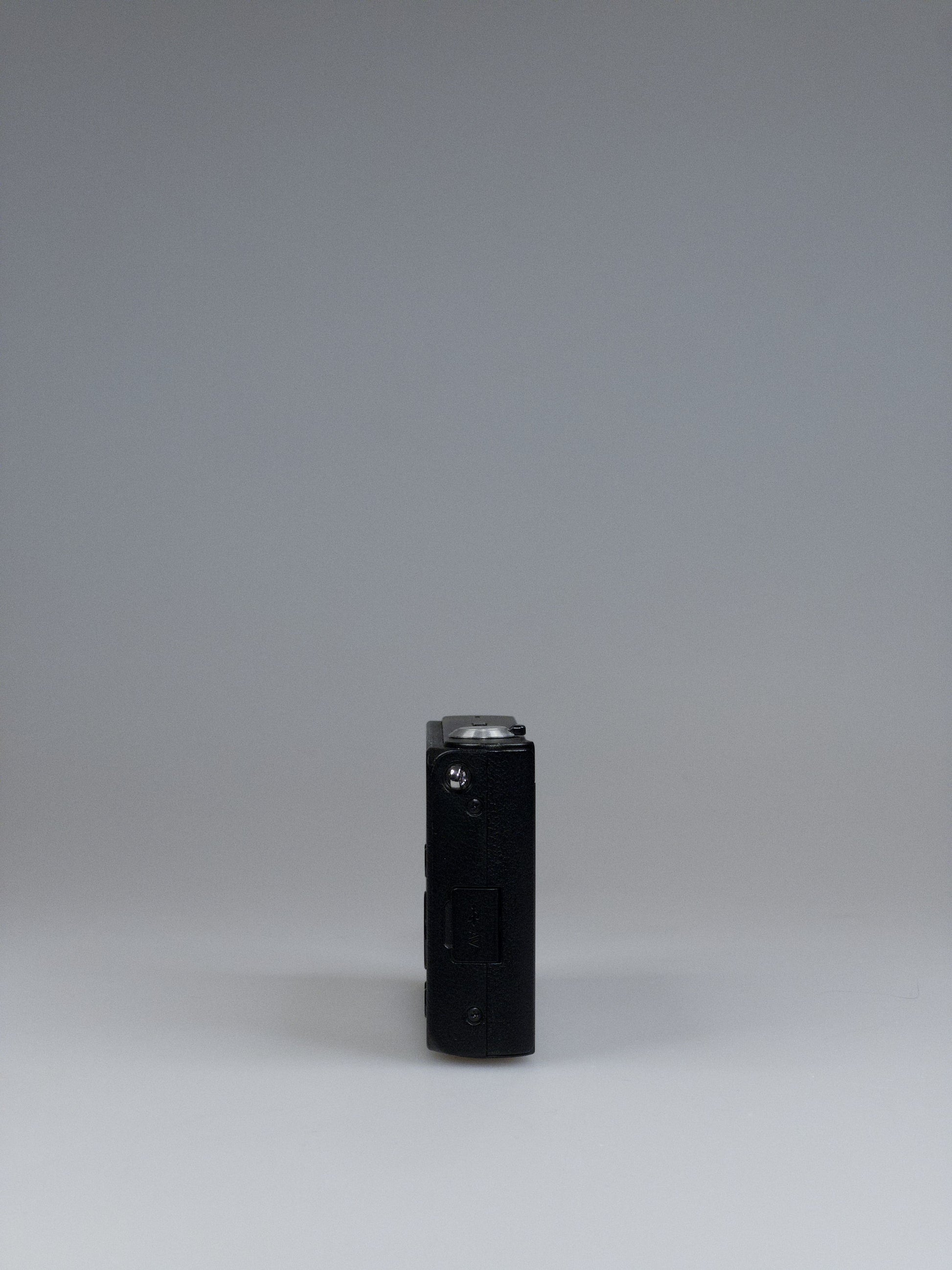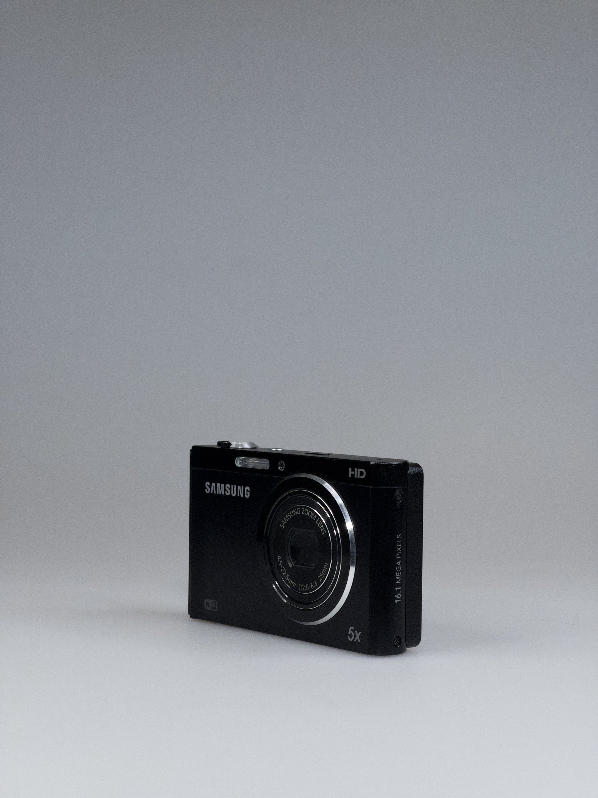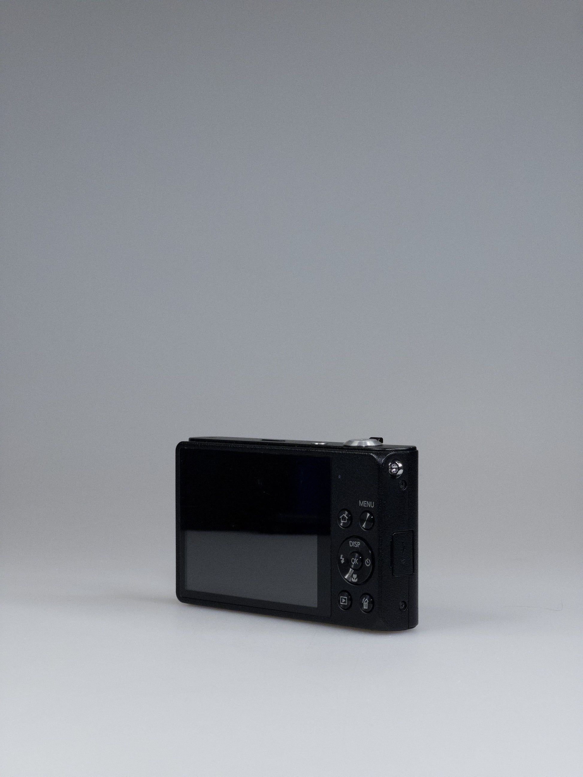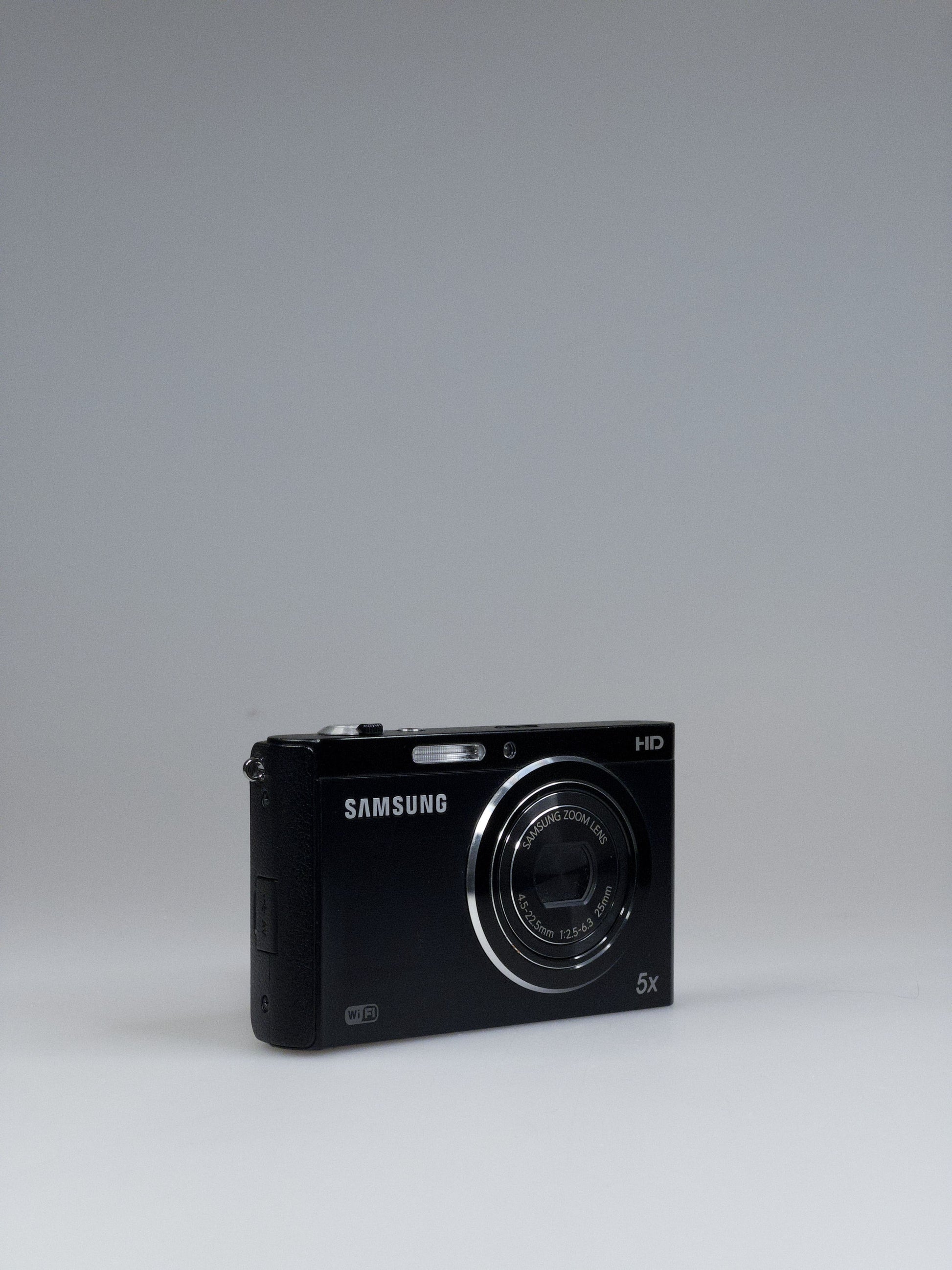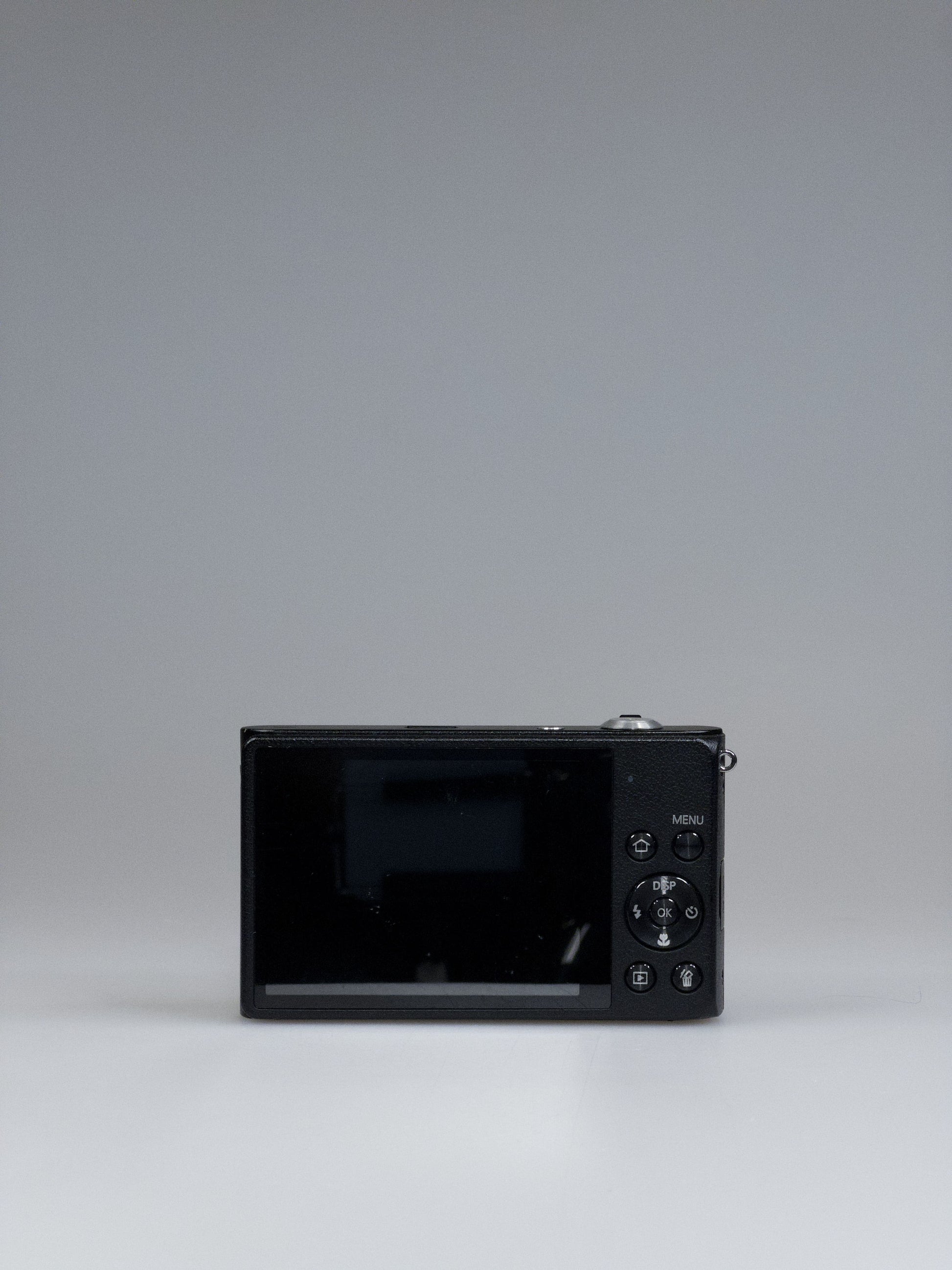 In black with dark navy accents, the DV300F has a subdued, professional look compared to the bolder red and blue variants. The camera measured 95.2 × 56.5 × 18.3mm and weighed only 120g, with a smooth brushed metal faceplate and textured faux-leather rear. The front-facing 1.5-inch LCD gave it its distinctive DualView identity for self-portraits and group shots.