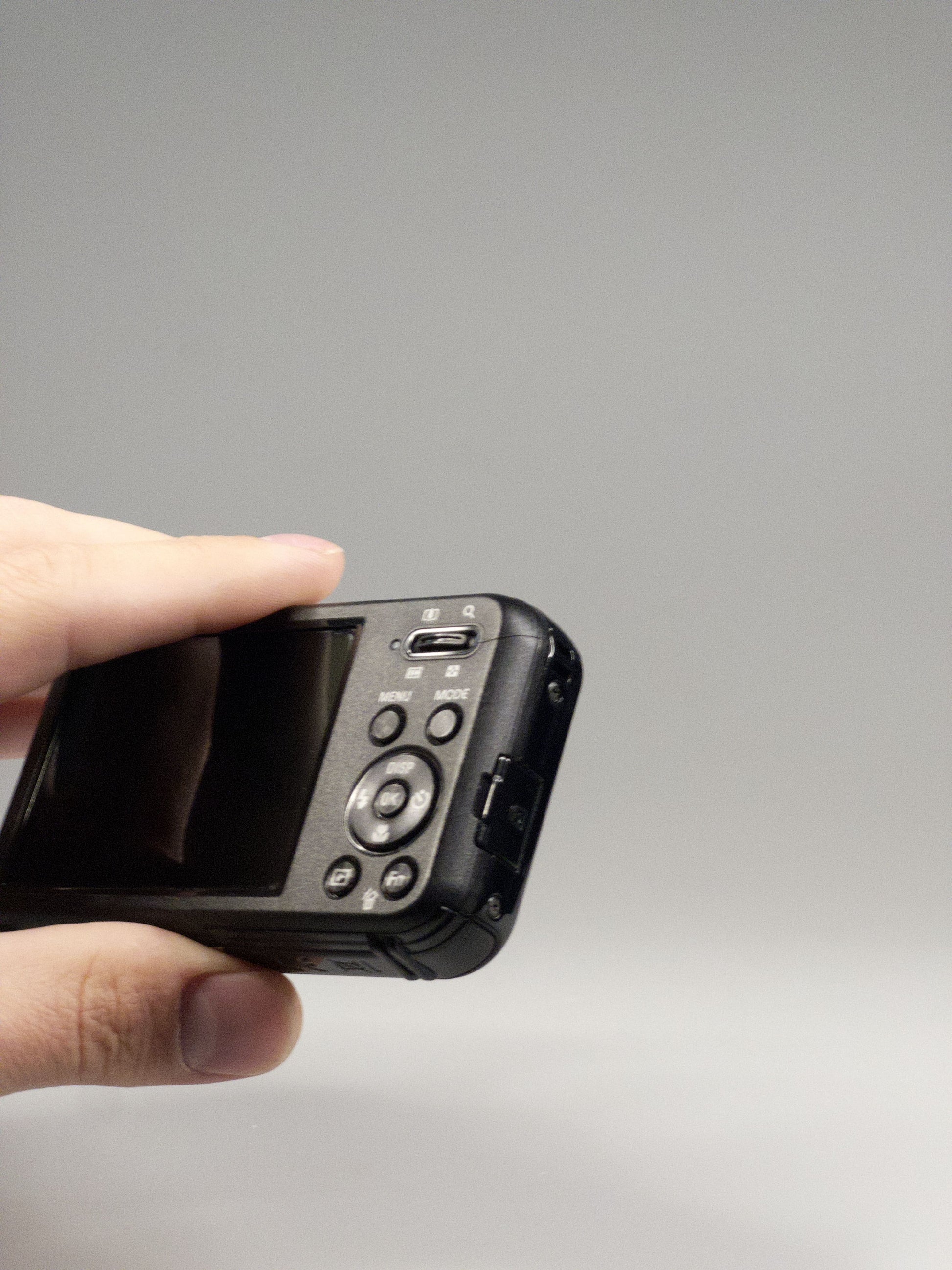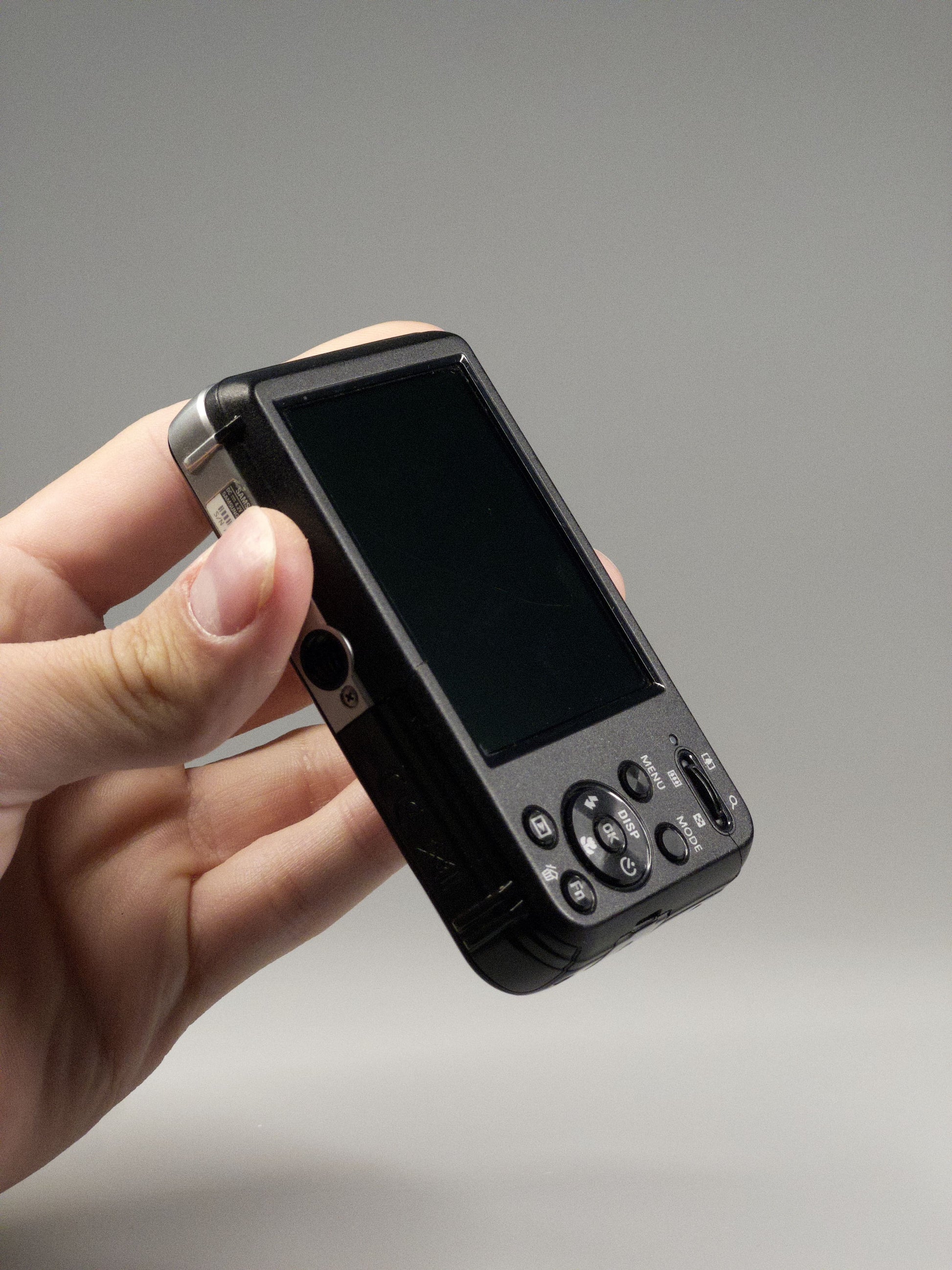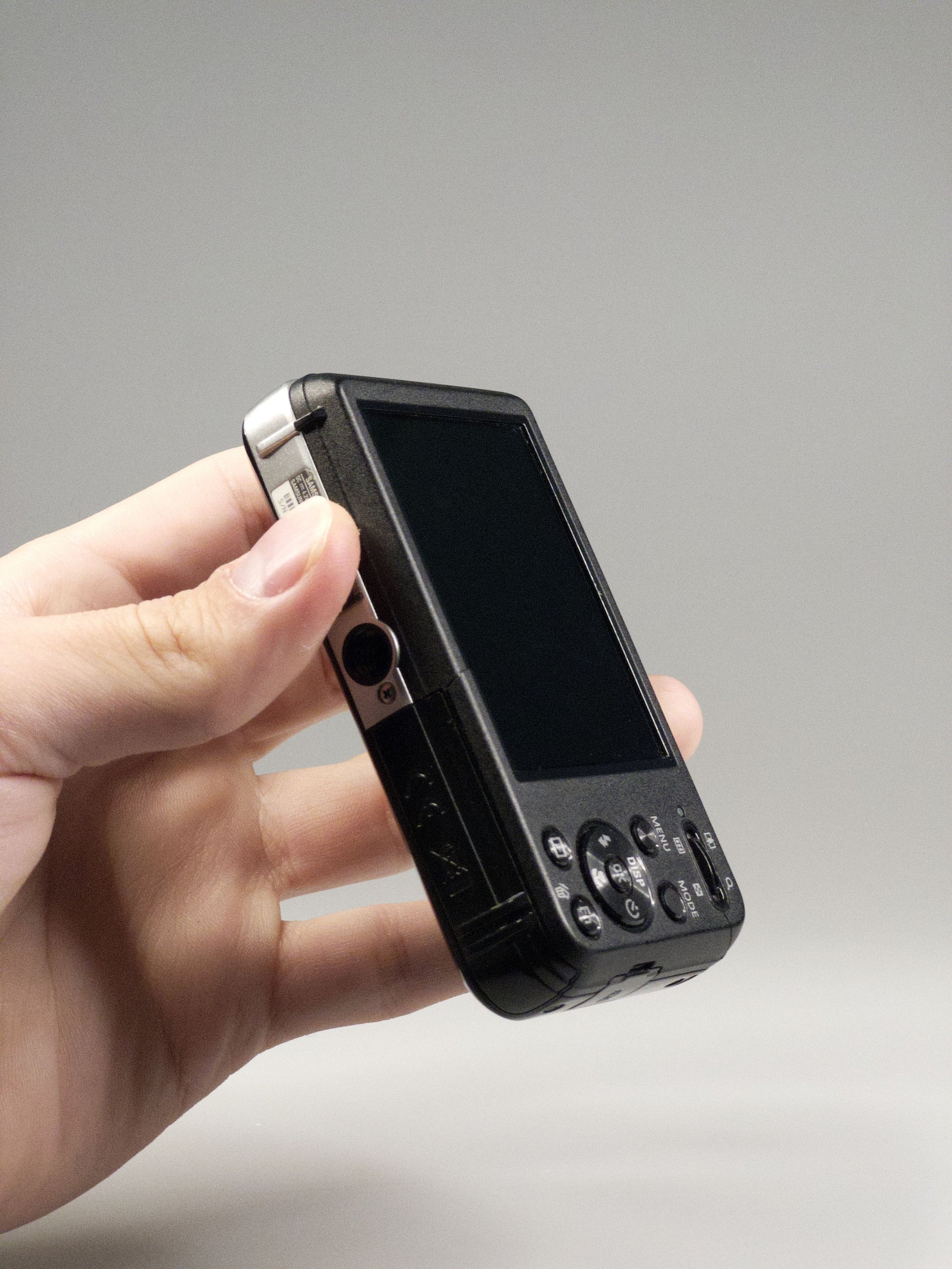 In black, the PL120 has a glossy, piano-finish shell with smooth edges and just the right amount of early-2010s shine. Its biggest statement sits on the front — a small LCD that flips the script on traditional camera design. The rear layout is clean and approachable, with a compact size that slips easily into any pocket or bag. At just 19 mm thick, it’s lightweight but feels satisfyingly solid in hand.
