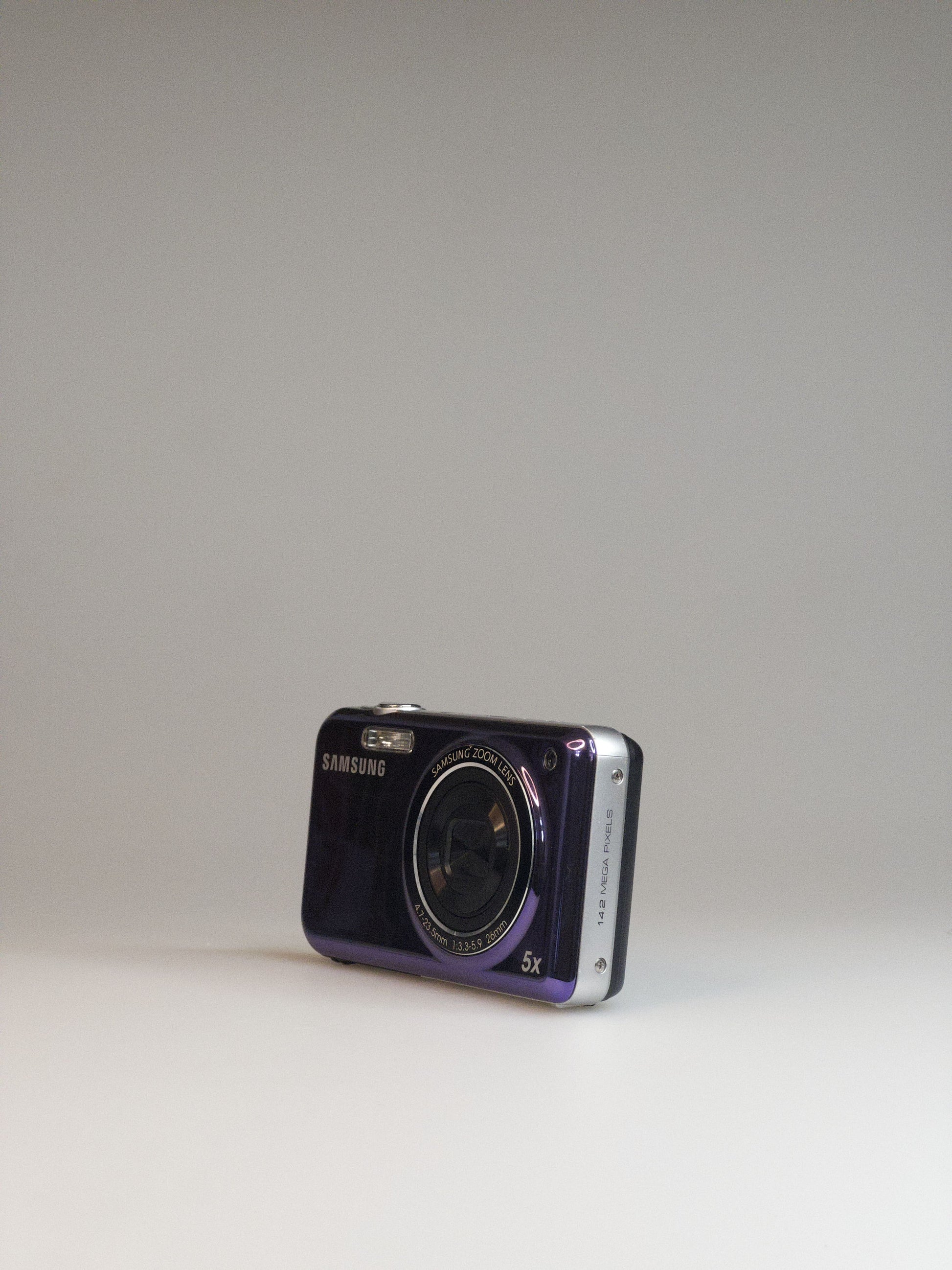 This little Samsung features a 14.2-megapixel CCD sensor with a 5× optical zoom (26–130 mm equivalent) and an aperture range of f/3.3–5.9. The front display measures 1.5 inches, while the main 2.7-inch LCD handles the bulk of shooting. It records 720p HD video and uses digital image stabilization to help steady your shots.
