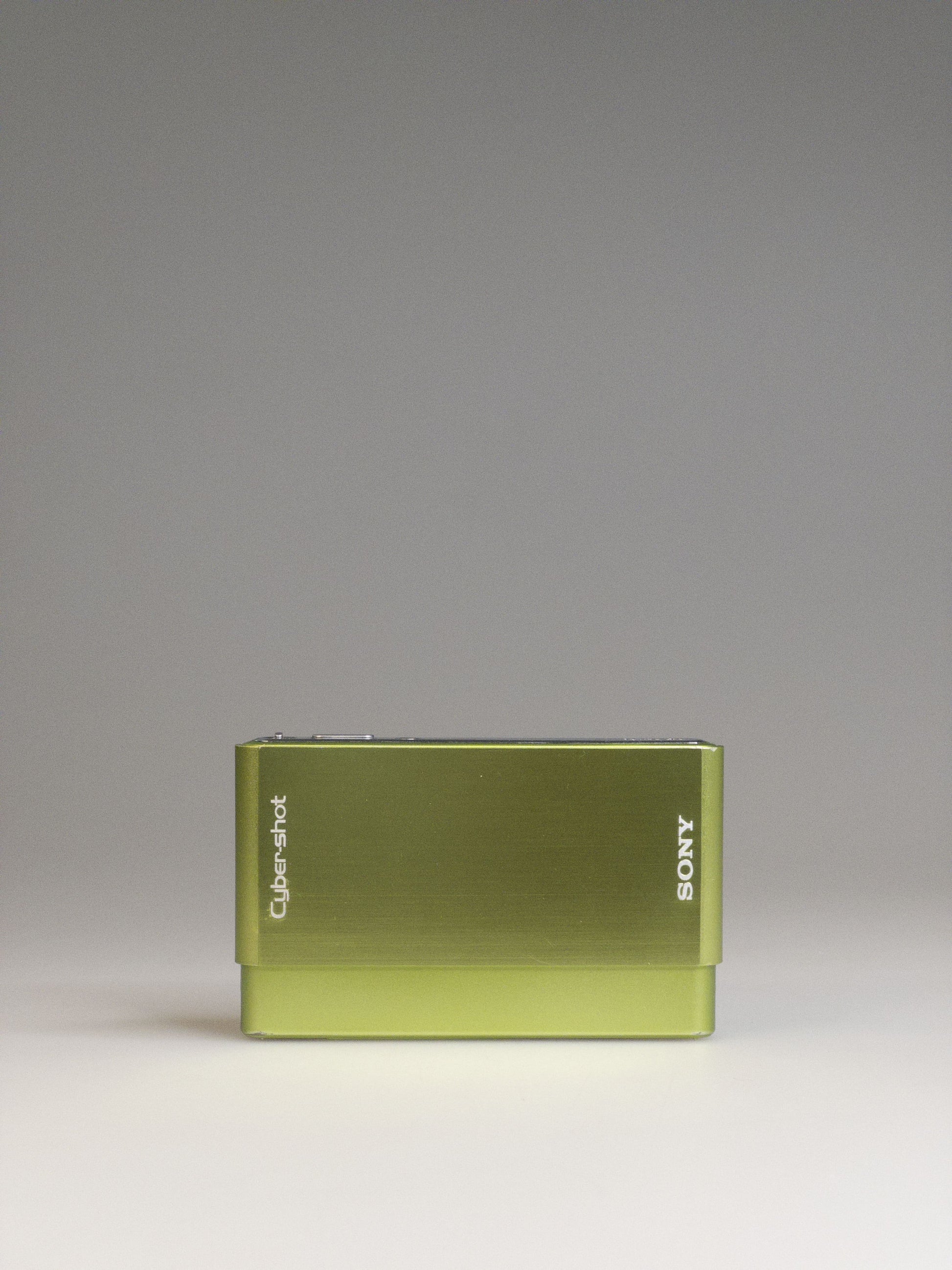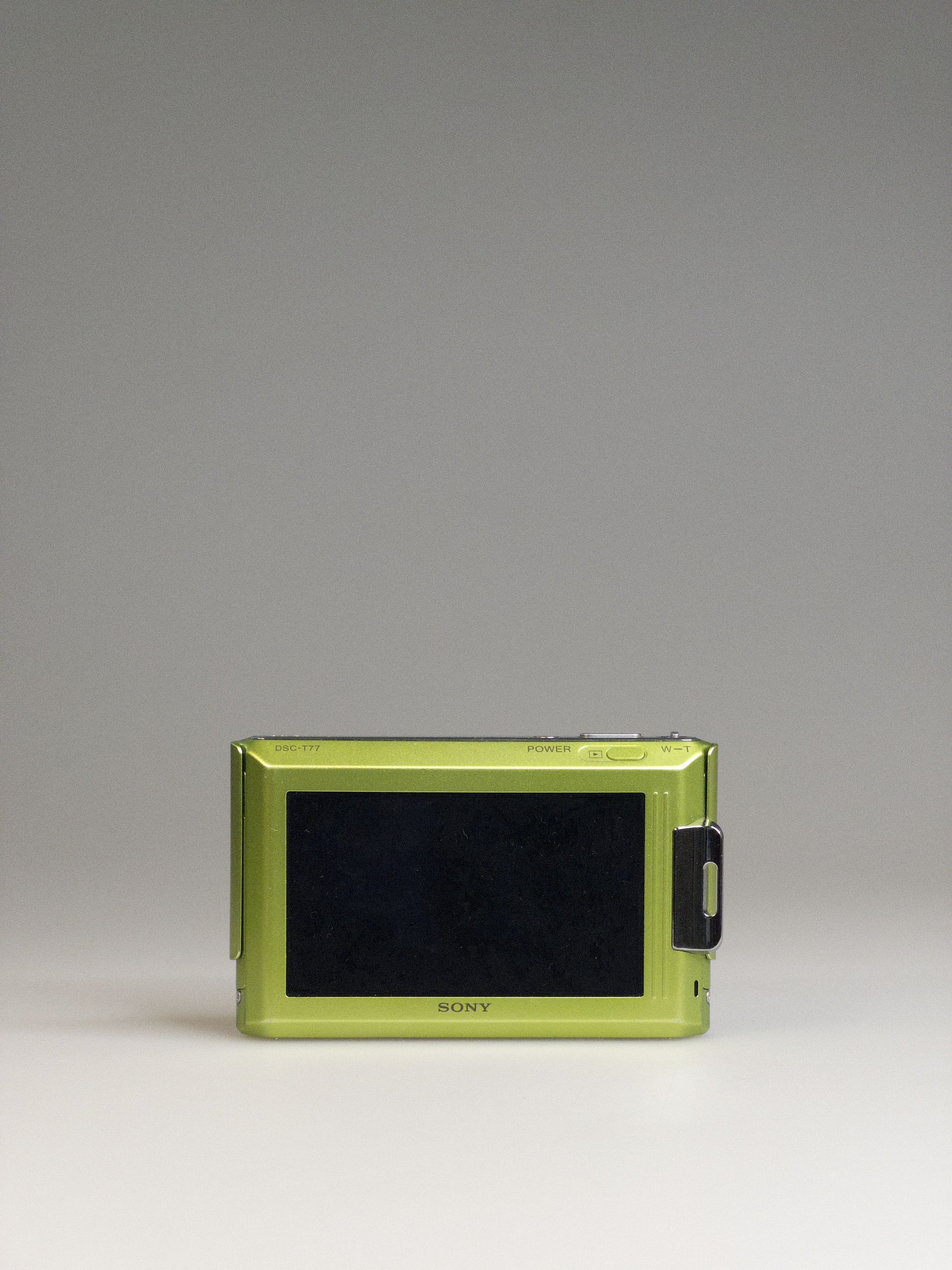 The green finish is bright and almost electric — a poppy, metallic shade that catches light in a way few compacts can pull off. Paired with its ultra-slim frame, it gives the T77 a playful but confident presence. The smooth front panel with its sliding lens cover feels like a statement piece, not just a camera.