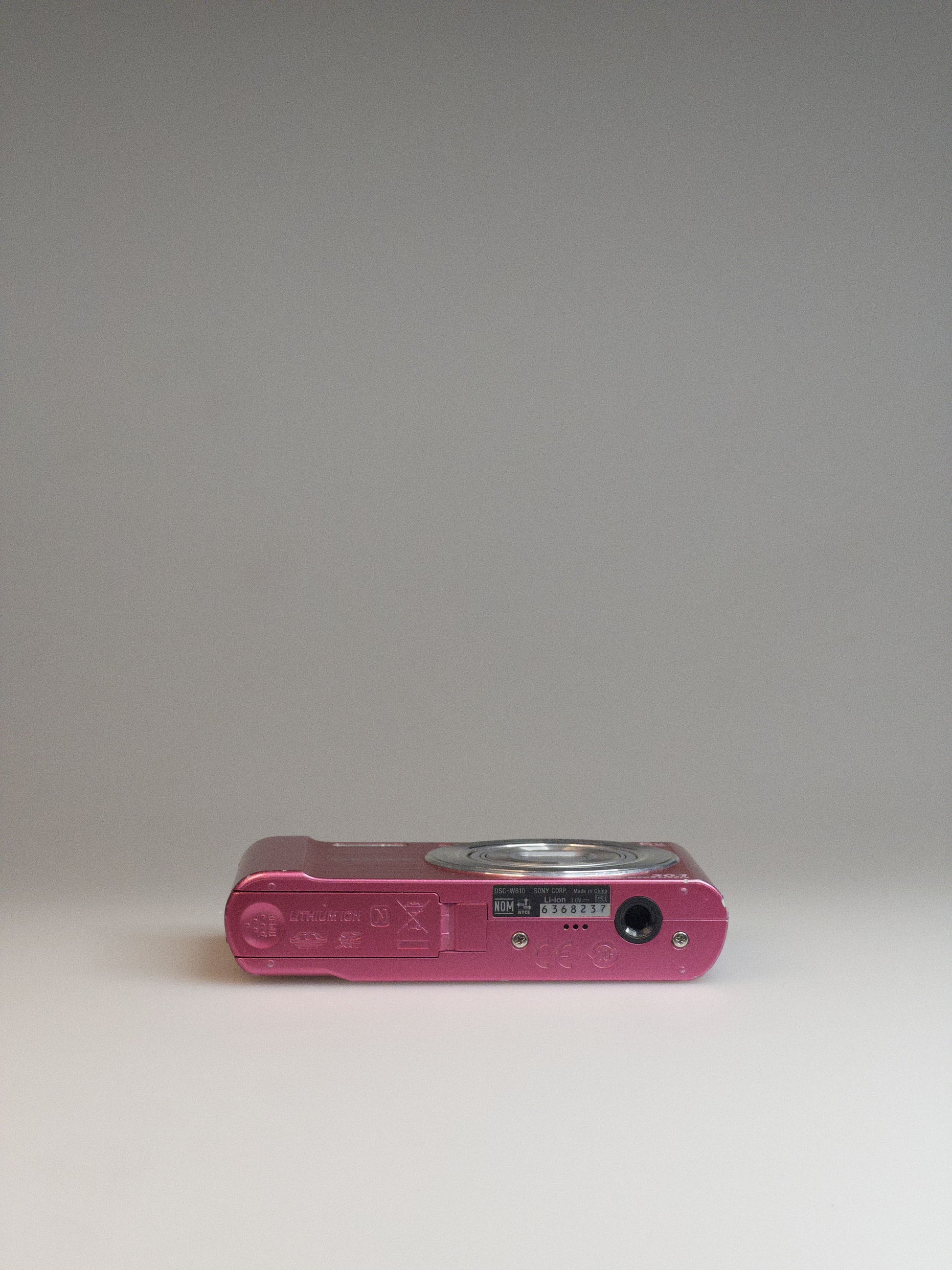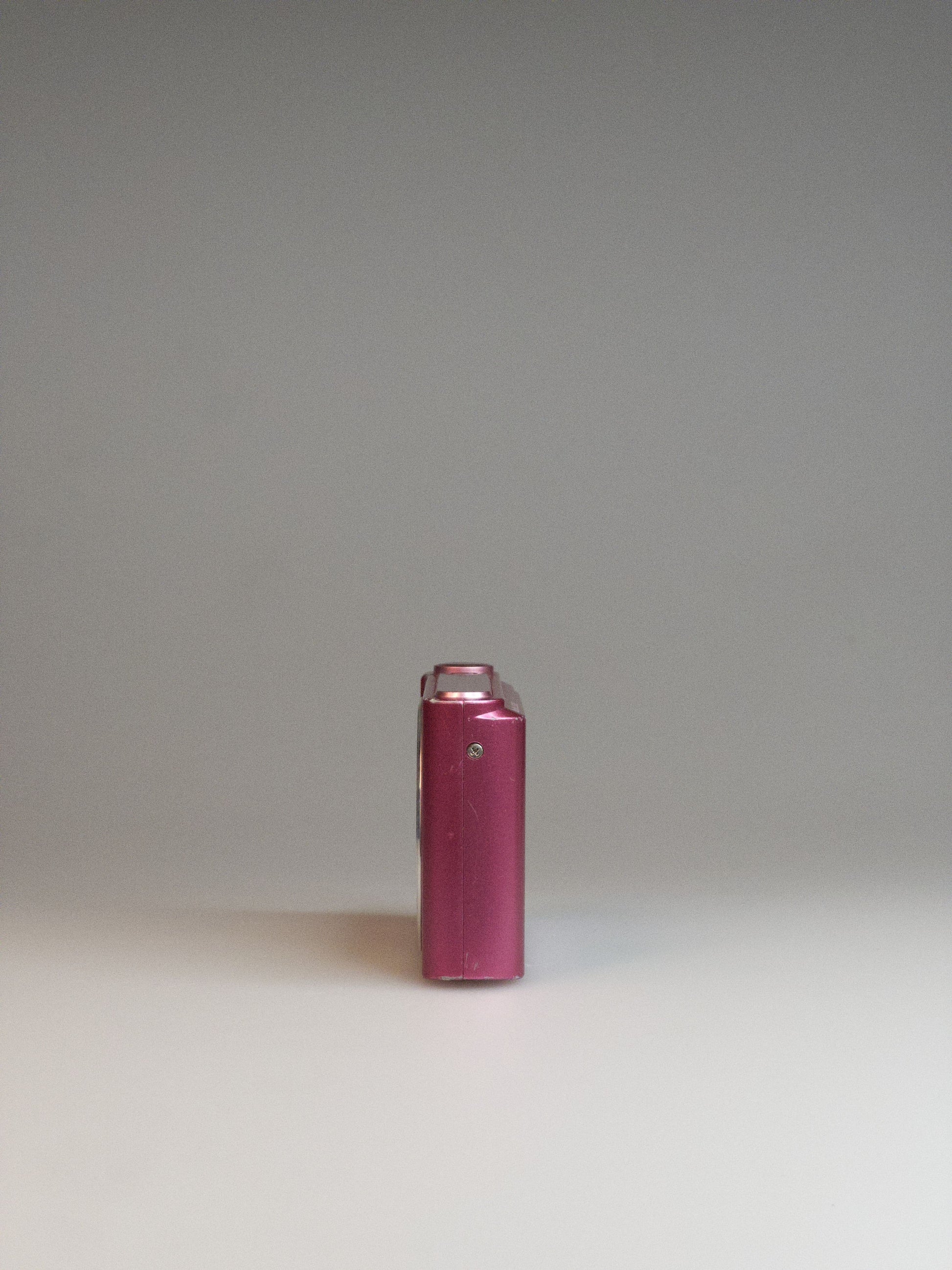 The pink finish isn’t shy. It has that candy-gloss shine that catches light and mood in equal measure — a little playful, a little polished. The body is smooth and compact with just enough curves to feel natural in hand, and it slips into a jacket pocket like it belongs there. This is not a camera you carry; it’s a camera that tags along.